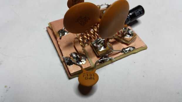 a continuación añades el condensador final. Tomar el otro condensador de disco de cerámica de 100 pF y soldar un cable a la placa 1 y la otra a tierra.