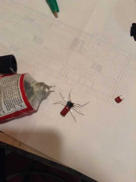 Usando su adhesivo preferido (mina siendo "Hogar Goop"), pegue el condensador pasado al frente del cuerpo con las puntas colgando hacia abajo como pinzas.