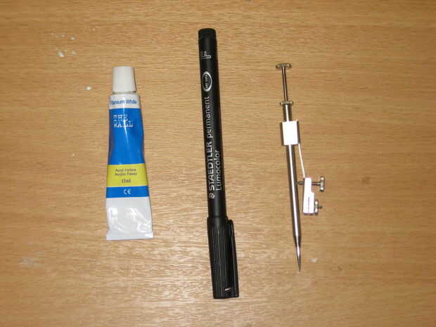 Acrílico color blanco como un pequeño punto de un marcador resistente al agua como la pupila del globo ocular. Para obtener el ojo pintado cada pincel sería a grueso. Una solución easyer mucho es usar una aguja o alternativly un alambre. Estos pueden también ser simplemente limpiar y reutilizar.