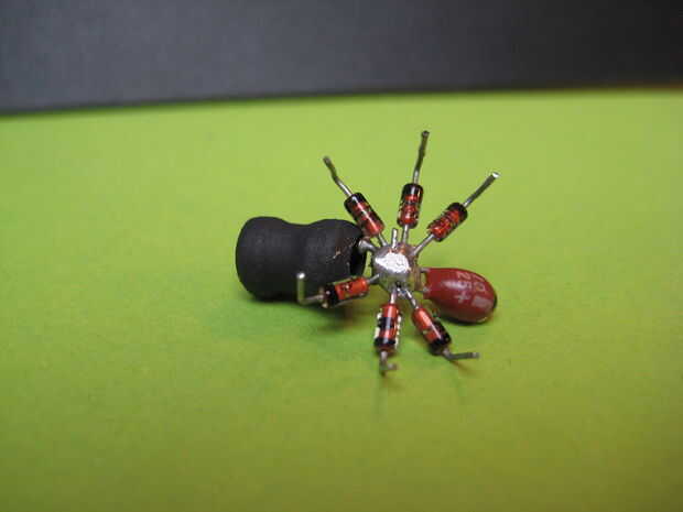 1. recoger las piezas. Si usted no tiene 6 diodos también podría utilizar cualquiera de los componentes con plomo axial que tiene. Puede reemplazar la inducción con un condensador pequeño.