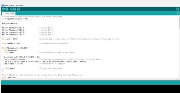 En una simple explicación el arduino se engancha hasta 4 termistores que forman parte de circuitos divisor de tensión. De estos circuitos podemos obtener una señal analógica de lo que la resistencia de los termistores. El código entonces toma esos valores y los convierte a Fahrenheit grados. Cada cinco segundos el arduino Lee cada termistor y toma el promedio de los cuatro. Luego guarda ese promedio a una variable. Entonces cuando el arduino Lee los termistores nuevamente promedios el promedio de los termistores con el promedio de los termistores de los anteriores. Después de cinco minutos determina si es más frío y la temperatura deseada mediante el uso de la media. Esto activará el led rojo o verde.