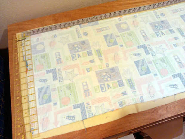 Coloque a la tela estampada y paño grueso y suave derecho lados juntos y cortar los bordes rectos. Usted puede hacer cualquier tamaño que desee a estos sacos de dormir, pero me gusta intentar alrededor un trozo de 40 pulgadas por 16 pulgadas pieza (más o menos unas pocas pulgadas está bien, cualquier tamaño de chatarra tienes en mano). El lado largo del rectángulo debe ser alrededor de 2.5 veces el lado corto, en orden para el diseño a trabajar.