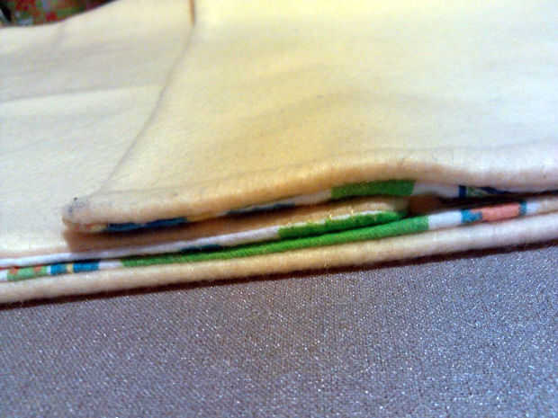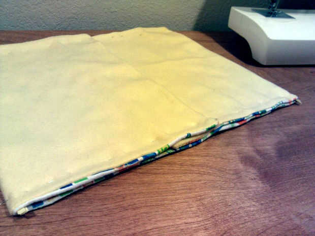 Con el paño grueso y suave hacia arriba (no te preocupes, acabará en el interior de la bolsa), pliegan y se superponen los dos extremos cortos del rectángulo cosido por un par de pulgadas en el centro de los lados largos.