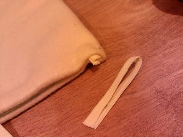 Ahora para hacer lazos para la hamaca colgar por, o para asegurar a los bordes de la jaula como un saco de dormir, encontrar cualquier cinta, cordón de zapato, pedazo de tela trenzada, etc. (utilicé encuadernación borde sobrante cosido juntos para esta hamaca) y cortar cuatro piezas de 4 a 5 pulgadas de largo. Crear cuatro bucles e introducirlas dentro de las esquinas dobladas de la bolsa, extremos colgando y asegurado con un alfiler.