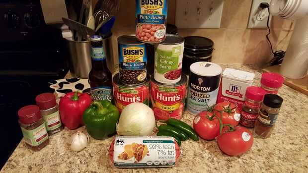 2 a 3 tipos de frijoles enlatados (hoy he usado Pinto, riñón rojo oscuro y negro. Observe que ninguno de ellos dice frijoles Chili... Si quería que alguien de otra idea de condimento de chili comer Chile conserva.)