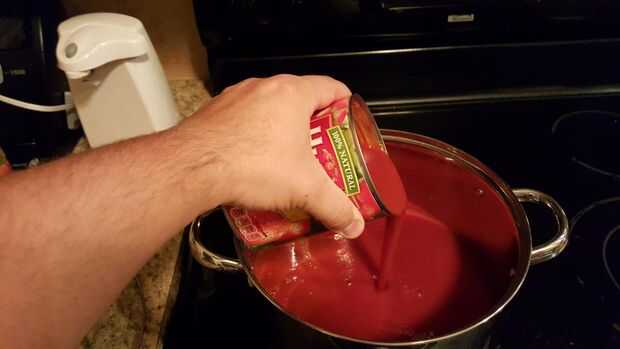 Vierta las 2 latas grandes de tomate en la olla y el calor se aplican. En la estufa me gusta a fuego medio, en la Croc me gusta cocinar en baja por 6 horas o alta para 2.