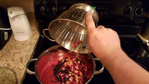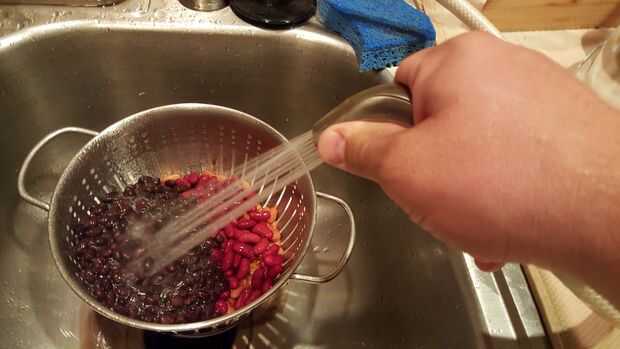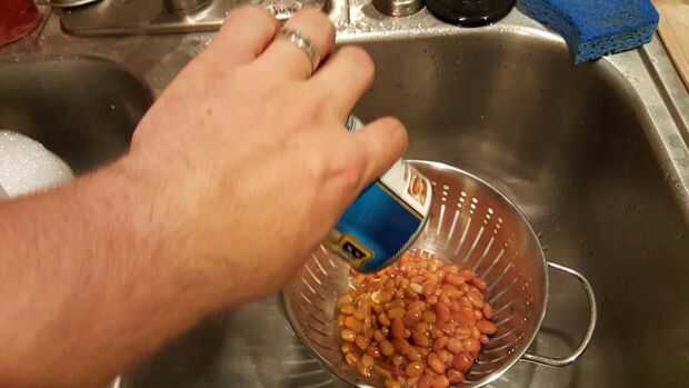 Una vez la salsa en la olla y el calor se ha aplicado las latas de frijoles y vierta en un colador. Enjuague los frijoles con agua fría. Esto conseguirá la mayor parte de la salsa y jugos fuera de ellos para que el Chile no demasiado caldoso. Una vez han escurrido, añadir a la salsa en la olla.