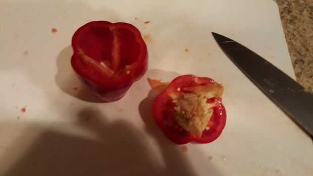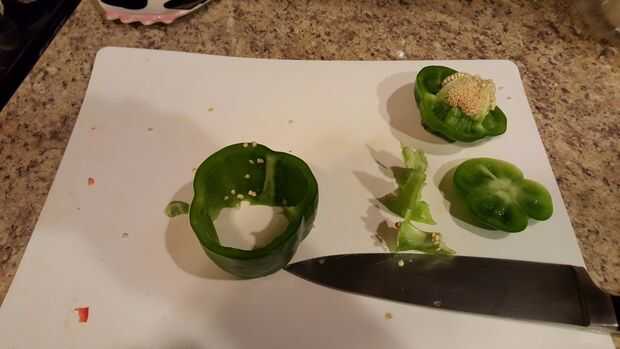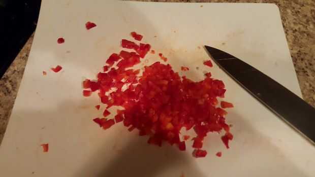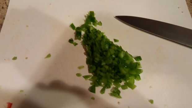 Así que quitar la parte superior e inferior de la pimienta tire las semillas a y dados los pimientos encima. Al igual que el tomate puede cortar cuadritos como grande o pequeño como usted quisiera! De cualquier manera una vez que son picados añadir los pimientos a la olla!