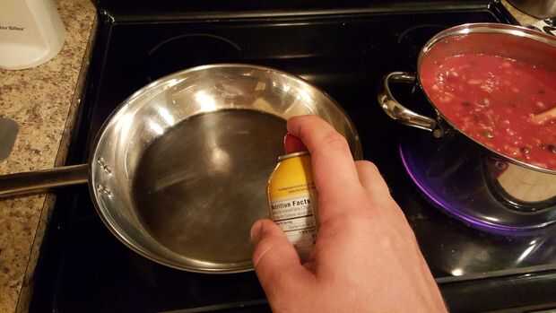 - Retire la cacerola del fuego (fuente de ignición) y rociar la sartén con el spray antiadherente