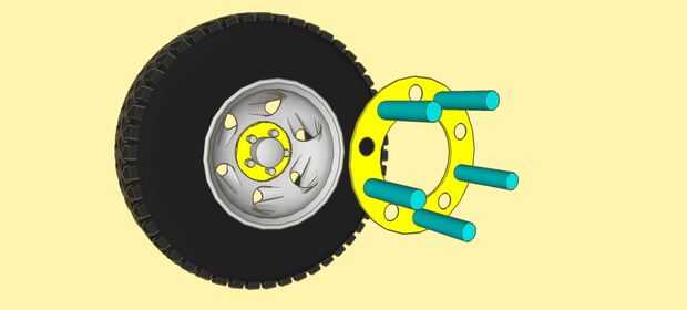 Ahora encontrar algún material sólido como tubos de acero o stock cuadrado o algo (aqua blue). Su diámetro externo (o equivalente) no puede ser mayor que la distancia entre los diámetros interior y exterior de su 2.0 HVP. Cortar este material en cinco pedazos, suponiendo que tiene lug cinco pernos en su eje. Si tienes seis zapatas de pernos, corte seis pedestales, etcétera. La longitud de cada pedestal será igual a su TODM. Soldar a la 2.0 de PVH (amarillo) que son compensación de y centrado en el entre los orificios de orejeta de 2.0 HVP.