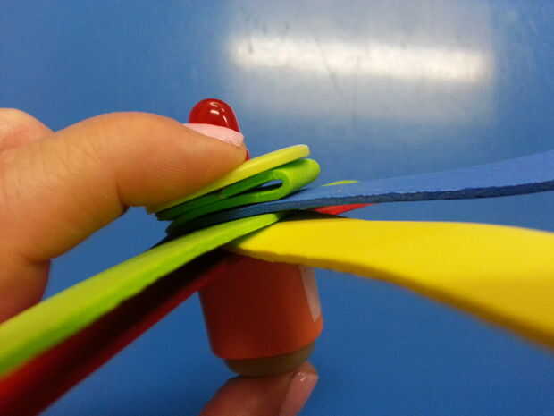 7. use una escuadra de pegamento para colocar el soporte de la batería del botón, el LED y la moneda a los propulsores de la espuma. Luego empuje el chisme entero en el eje del motor. Asegúrese de que todo es bonito y cómodo.
