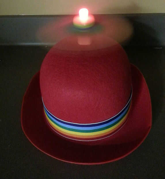 Este diminuto sombrero está cubierto de pegatinas de LED que se desvanecen y apaga y encienden en reacción al ruido. La electrónica está todo hecha con materiales de Chibitronics de construir de la noche de YuKonstruct y el sombrero se hizo siguiendo