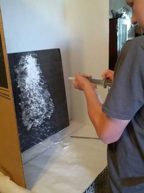 Preparé mi moco espeso para el experimento y preparado el área de pruebas. Apliqué la mucosidad espesa a la Junta Directiva de prueba y estaba parado contra el tablero. Mi asistente sostuvo el filtro delante de mi tablero de pruebas. Roció la harina en el filtro. De mis medidas, determiné que el filtro capturado 13 gramos de harina y 24 gramos de polvo fue recogida de la hoja de plástico de congelador.
