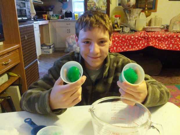 Mi primera receta fue 1/8 de taza de bórax en 473,18 ml de agua tibia y agitaba hasta que fue disuelto el bórax. En otro tazón, revolvió juntos dos cucharaditas de gel de pegamento y tres cucharaditas de agua. Añadí unas gotas de colorante alimentario verde y agitado. Entonces derramé ambas mezclas en una bolsa de plástico. Entonces había sellado y había aplastado las mezclas juntas. La mezcla permaneció líquida y nunca llegó a ser una baba.