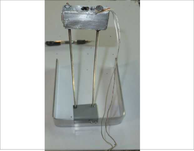 El otro extremo de las varillas de 3/16 están montados en una pieza de acero o aluminio para equilibrar el bloque de calentamiento y manténgalo vertical durante la prueba. Asegúrese de que es constante ya que no quiere caer contra el acrílico a 300C..!