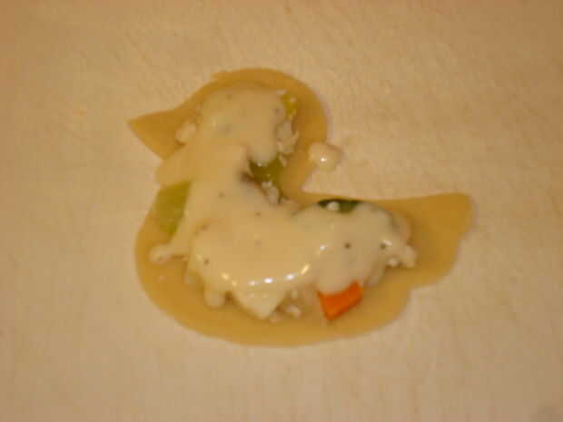 Suavizar la salsa dejando una pequeña sección de masa alrededor del pollo al ser presionado.