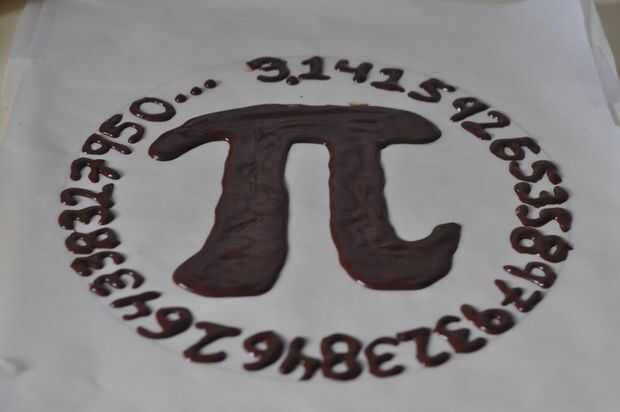 a continuación llene una manga pastelera con el chocolate derretido y ajustarla con una punta redonda pequeña (Yo utilicé la punta de Ateco #4 que vino en mi set de tubería). Trace con cuidado sobre el patrón que creaste. Una vez que haya hilo todos los números y el símbolo de pi grande, puede tubo tantos símbolos pi pequeño como usted desea, le sugiero por lo menos 50 para obtener trozos de chocolate crujientes en cada bocado. Coloque los patrones con el hilo chocolate en la nevera para endurecer durante unos 10 minutos.