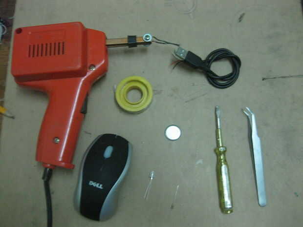 Las piezas son realmente sencillas para hacer este proyecto sólo necesita menores $1 (sin el mouse) Un ratón de ordenador roto Una pila de litio V 3.0 Un resistor de 100 ohmios 1/4 Watt Un LED blanco (otro color es bueno) Cable USB (puedes encontrarla en el ratón) Un pequeño interruptor SPDT