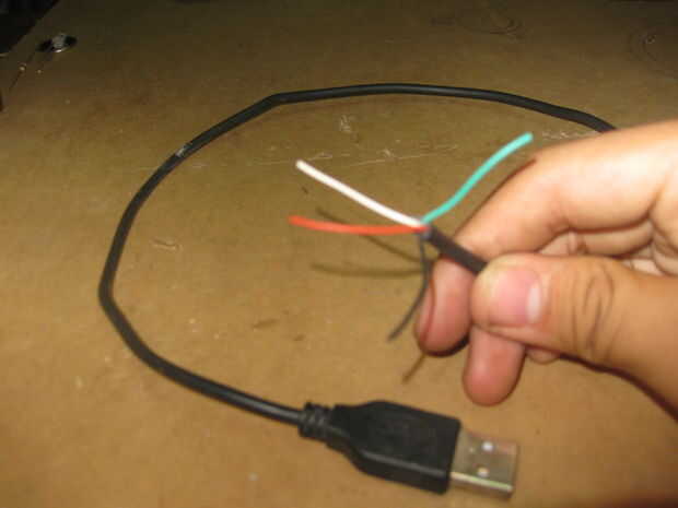 En primer lugar, pela la capa exterior del cable USB. Hay cuatro cables: rojo, negro, blanco y verde.