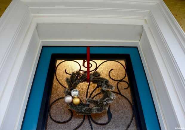 Tenía la idea de utilizar las perillas de puerta como un arco, pero alcanzó para que unas bolas de vacaciones y la cinta para mantener el aspecto más tradicional. Estoy salvando a los pomos de la puerta para un proyecto de futuro upcycle.