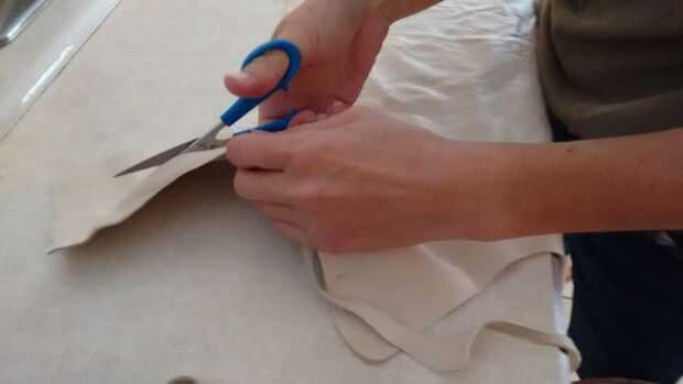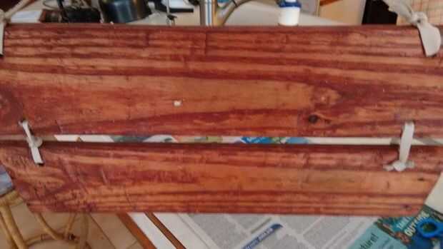 Cortar tiras de cuero de un cuero de otro proyecto, para conectar las dos piezas de madera, sobre un ancho de dedo aparte y luego atado a un pedazo más largo en la parte superior como la suspensión.