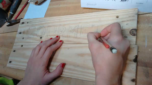 Nos decidimos por una fuente de estilo agradable de la frontera para el signo de abuelo Gourmet. Todo lo que utilizas, espacio cuidadosamente para asegurar las letras eran una buena altura legible y ancho, y las palabras se centran en su tabla. Nos libre entregó las letras, pero también podría plantilla o utilizar un retrato silueta para crear las letras.