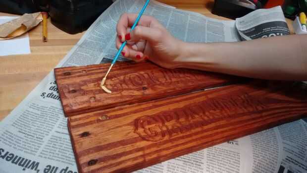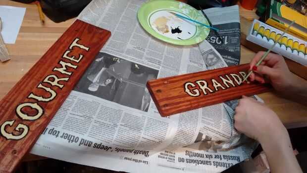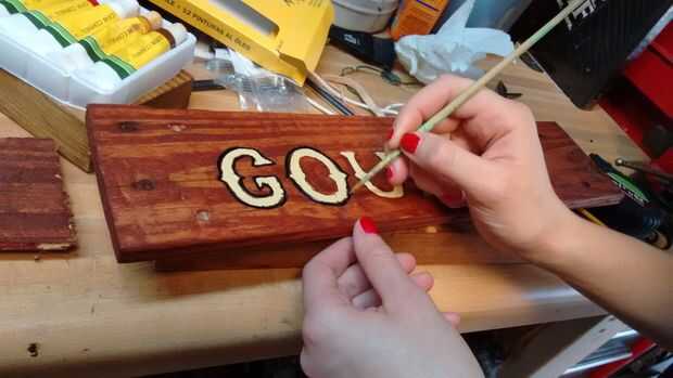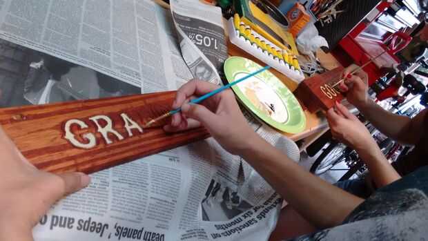 En nuestro caso, había pintado en las letras un color contrastante con la pintura al óleo - pálido amarillo para nuestros propósitos - entonces había delineado en negro y apartar a secar otra vez. Ha sido súper húmedo en Tampa, por lo que tomó para siempre para secar, por lo que dependiendo de donde usted vive, puede preferir usar un tipo diferente de pintura, como los acrílicos.