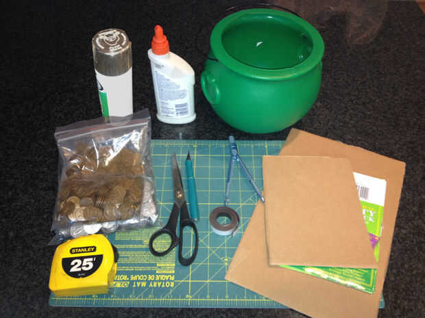 Usted probablemente ya tiene la mayoría de estas cosas. Sólo tuve que comprar el pote plástico, por lo que mi costo total para este es de $4,00. La encontré en una de esas tiendas de fiesta. Ya tenía las monedas de plástico pero las tiendas del partido las llevan así. Usted puede comprar monedas que ya son de oro pero todavía recomienda que la pintura de aerosol. Se oculta cualquier pegamento o expuestos de cartón... más en eso más adelante.