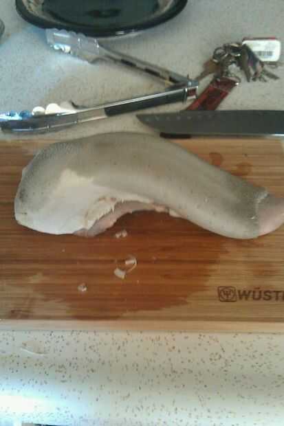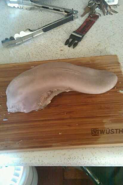 A continuación se que desea pelar la piel de la lengua. Es de goma no se sienten y debe salir fácilmente dado que han cocinado lo todo el camino. Tomo nota de que es importante que se baje toda la piel. La primera razón es que, bueno, creo que sería bruto comer piel de lengua de vaca áspero, y en segundo lugar se dificultan en el proceso de conserva en vinagre.
