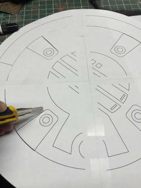 Los patrones de plata se corte y trazados sobre cada disco de herramienta-bay (los paneles naranja).