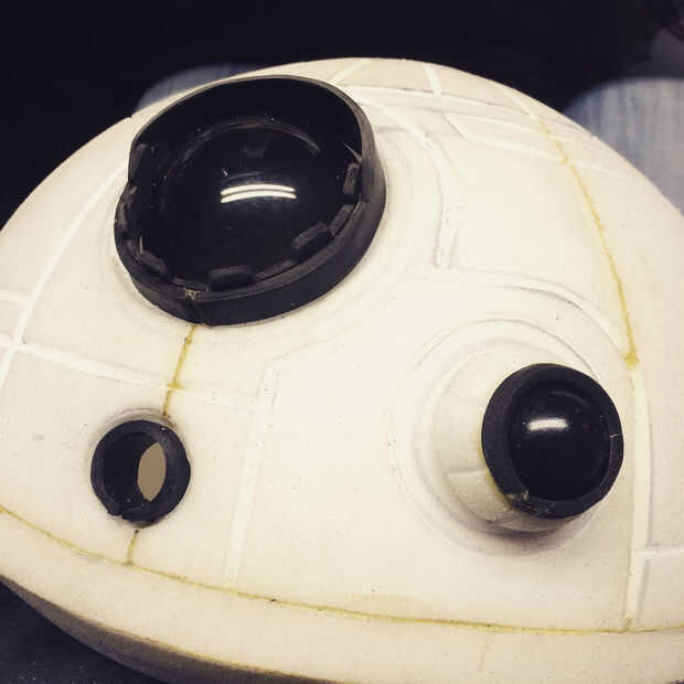 No visto aquí son las antenas. BB-8's pato de goma antena fue rescatado de una tienda de junck y pintado de blanco. La antena más grande fue hecha a mano usando un barra de acero y espuma.