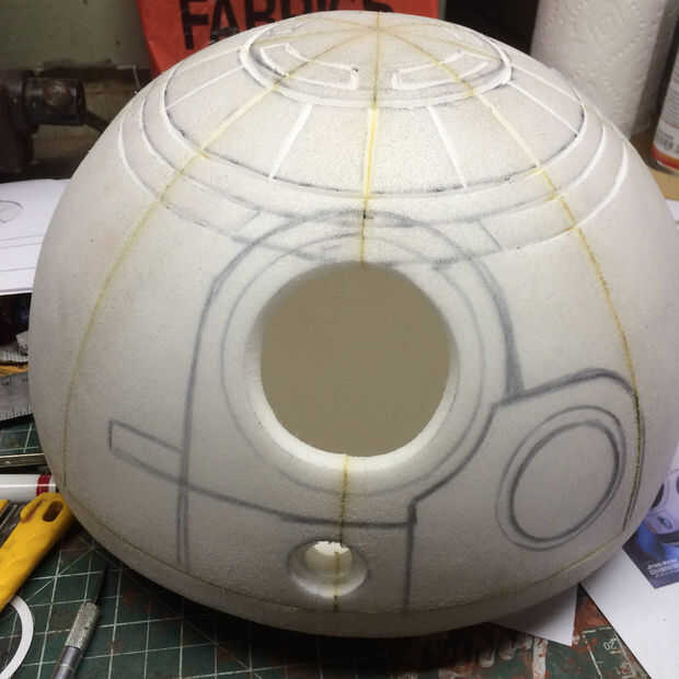 Comencé cortando a los orificios faciales en cabeza del BB-8. Su fotorreceptor primario (el cúpula ojo negro grande) fue creado con la mitad de una bola de adorno de plástico transparente en Miguel. Pasó a ser muy cercanos en tamaño y funcionó bien. He pintado en el interior con pintura de aerosol negra transparente. La carcasa alrededor del fotorreceptor fue construido a mano utilizando sintra (PVC cartón pluma)