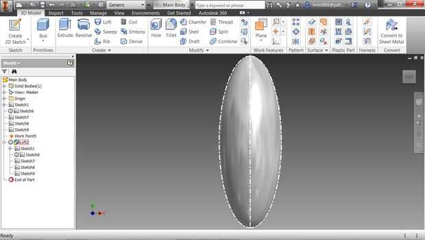 Ahora crear un boceto sobre el plano YZ y utilizar los bocetos anteriores de dos para hacer una elipse que intersecte tanto de las elipses anteriores. Luego, otra vez, recorte la mitad izquierda.