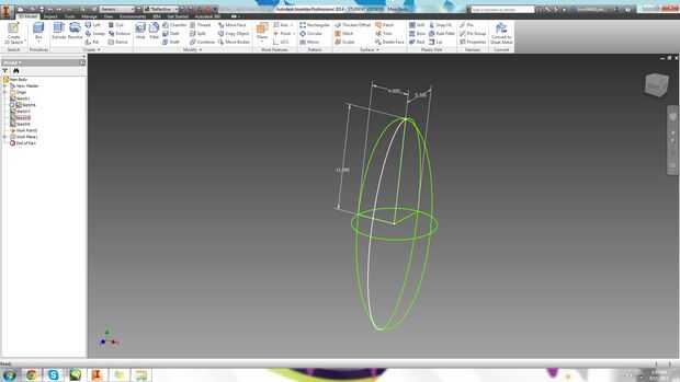 Crear un segundo dibujo en el plano XY y hacer una línea en el eje X desde el centro es de 4 pulgadas de largo y luego otra línea desde el centro a lo largo del eje Y que es de 11 pulgadas de largo. Crear una elipse usando los 3 puntos, conseguir el corte de la herramienta y cortar el la mitad izquierda de la elipse y terminar el bosquejo. (puede que necesite colocar un punto en cada extremo de la elipse para que el corte de la herramienta sabe los límites de la guarnición)