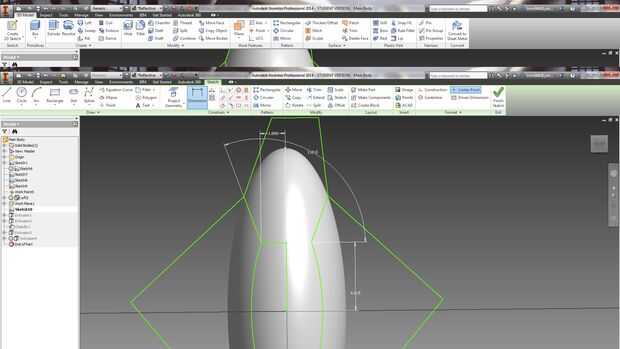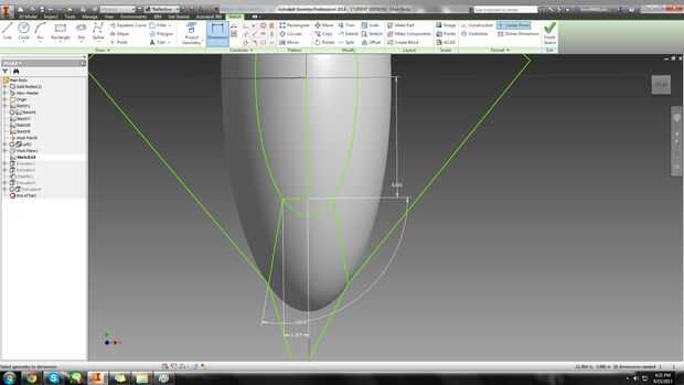 Haga una línea a partir del centro y bajando por el eje y que es 5,681 pulgadas de largo. Hacer otra línea va de eso uno, paralelo al eje x y ejecutar izquierda es 1,167 pulgadas de largo. Una vez más, debe interceptar con la elipse que nos dibujó. Hacer una línea de ese punto final que es de 260 grados (con 0 a partir de la derecha del eje X y hacia la izquierda) (o 100 grados como se muestra en la foto de arriba) y se extiende más allá del cuerpo principal. Otra vez, no importa cuánto tiempo.