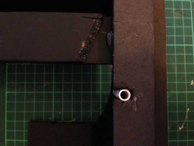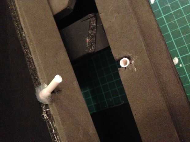 usé algunos tubos de estireno y barras que caben en uno a para crear algunas espigas de localización. sólo cortar una arboleda en la espuma inferior de shell (espuma de brecha de sombra) y pegar el tubo. luego pegué la varilla en la carcasa superior en un lugar que se deslizarán en el tubo para mantenerlo en su lugar.