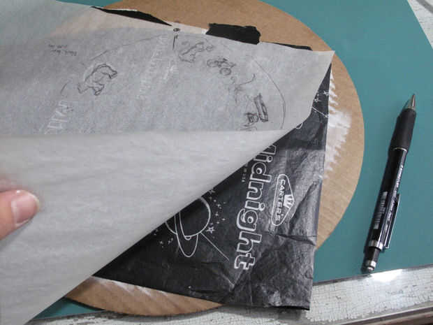 - Transferir el boceto en el disco seco. (alinearla con sus puntos de referencia en la cartulina.) He utilizado un trozo de papel de moda viejo... cosas utiles!
