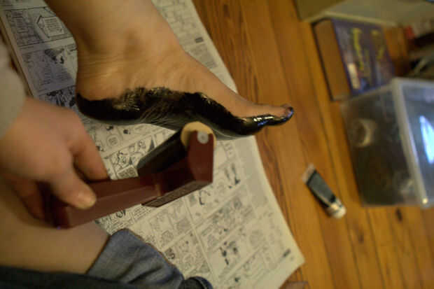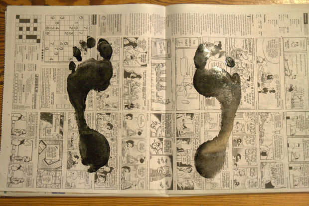 - Gato en el sombrero, hacer un lío por toda su casa y ver el punto negro crecen método... (sí es lo que hice) Haz alguna tinta soluble en agua, un rodillo y algunos periódicos. Rodillo de los pies con la tinta... paso al diario. TA DA! (Ahora averiguar cómo llegar al cuarto de baño con haciendo un lío :-) Agua y trapo cerca por sería útiles)