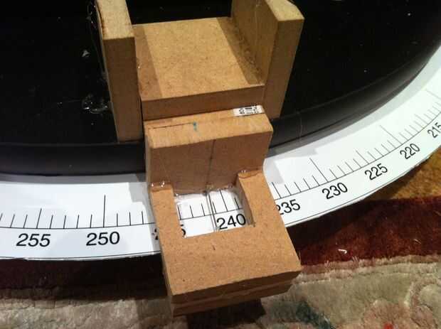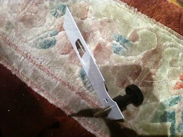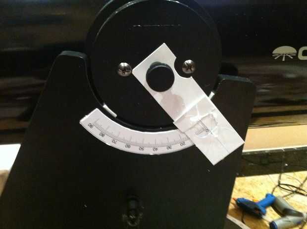 El indicador de altitud también es muy sencillo, lo hice con un pedazo de plástico que i didn´t cortar y cortar un agujero en el extremo de la misma y pegado otro perno en el centro. Cortar un agujero y poner el tornillo que viene con el telescopio.