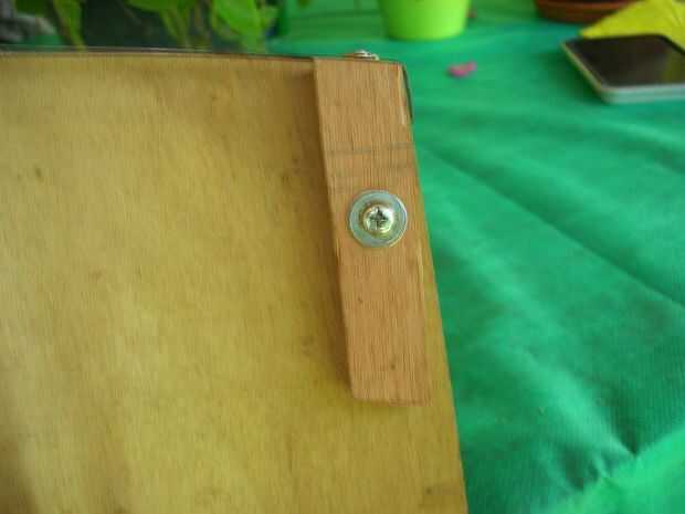 Perforó un agujero en el extremo de un trozo de contrachapado fenólico y enroscar el alambre de acero con un curvado lavadora en el mismo, para mantener firmemente en su lugar. A continuación hizo un agujero de 5 mm en el centro del stand pequeño y había atornillado a la pieza grande de madera contrachapada fenólica. Que tornillo permite rotar