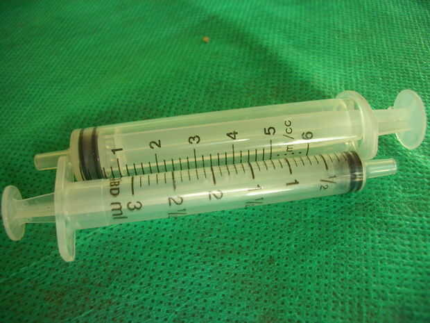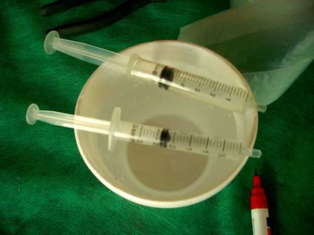 Encontré entre mis cosas dos jeringas usadas de inyecciones, una de 3 ml para la escala sensible y otra de 6 ml para la otra. Me asaltó la duda de que un mis errores de construcción y todas se podría agregar uno mayor en caso de las jeringas no estuvieran correctamente graduadas, pero luego me di cuenta de que, para el uso que yo le iba a dar a la balanza, ese error es irrelevante, dado voy a pesar TODOS los componentes con la misma balanza , y lo importa son los pesos relativos, no absolutos.