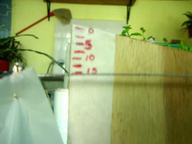Con cada carga de 2,5 ml el alambre se torcía unos 5 mm hacia abajo. Fui marcando la posición del mismo hasta la llegar a los 50 g, o sea cargué la bolsita de agua 20 veces con 2,5 ml de agua.
