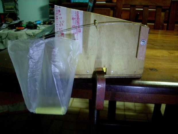 Para usar el soporte del medio, o sea la escala de 200 g, tengo agregar un hilo de coser de unos 20 cm, porque si no la bolsita roza con la prensa de mano sostiene el conjunto sobre la mesa. ¡TODO DISEÑO TIENE TENER UN ERROR.