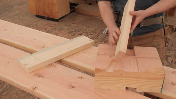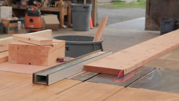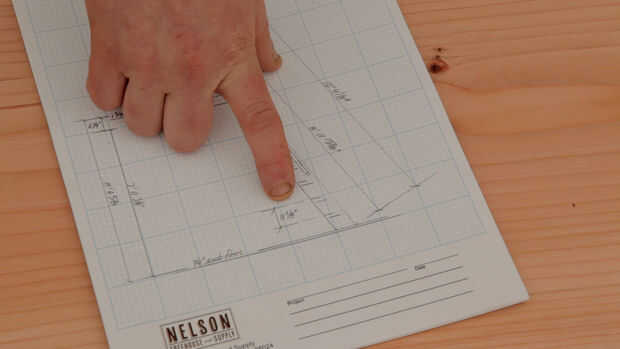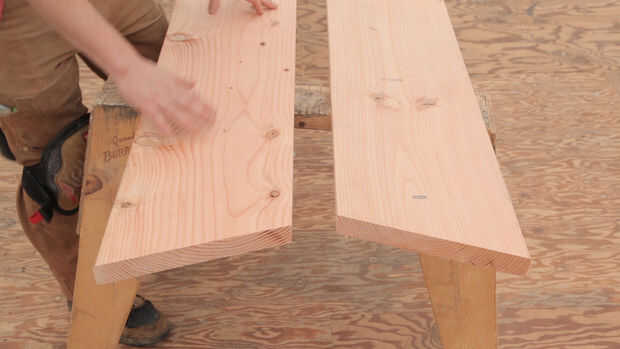 Nos gusta hacer nuestros escalones aproximadamente 12" aparte. Esto significa que vamos a tener que cortar una serie de bolsillos con un router. Para la preparación de la fresadora, rasgar abajo ambos largueros 2 "x 12" para que tengan un borde limpio, de 90 grados. A continuación, determinar el tono de su escalera de naves. Elegimos a 18 grados para este ejemplo. Entonces establecidos nuestros largueros sobre caballetes, por lo que fueron creando una imagen de espejo uno del otro. Ahora tiene un borde limpio en todas sus medidas de la base.