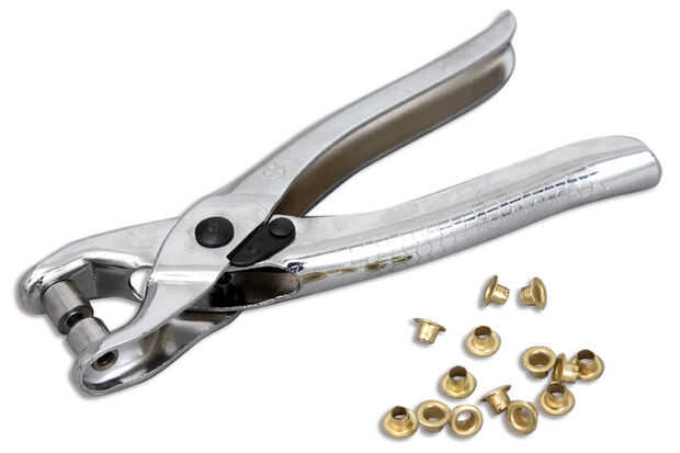 Usted también necesitará una pinza de ojete y algunas abrazaderas para reforzar los agujeros para los cordones (~ 10$ en una tienda).