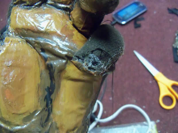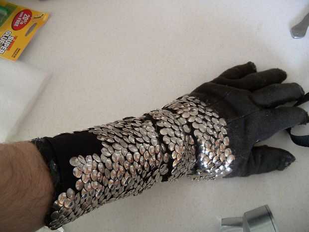3 comenzar a poner en escalas más. Esto es bastante fácil. Si usted elige el tipo correcto de tela, deben ir fácilmente. Recuerde fijar debajo del frente de las escalas cuando haces cada fila. He dejado los dos huecos para ayudar con el movimiento. El guante de lo contrario sería un poco tieso. Esta es la parte más tediosa de todo el proceso.