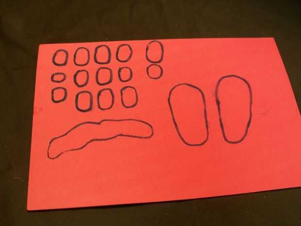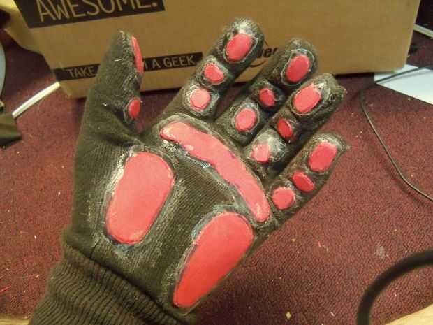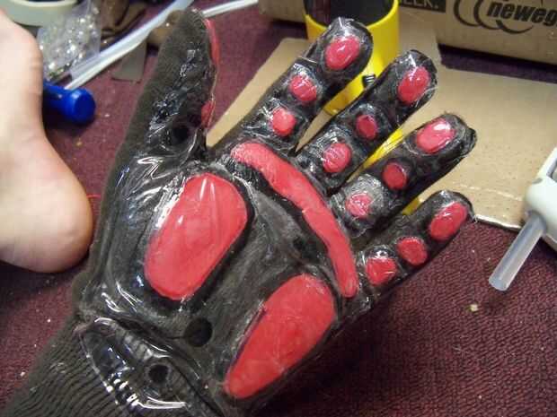 Con el guante más grande y cortados trozos de la espuma de arte para cada sección de los dedos y la palma. Asegurar con pegamento caliente y poner un poco alrededor de los bordes de cada pieza de espuma.