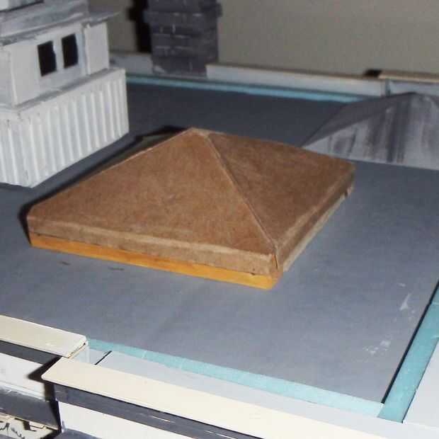 Cuatro estructuras de esquina se hacen como se muestra. Pintura de acrílico fue utilizada para acabar piezas que habían sido construidos de madera y cereal caja de cartón.