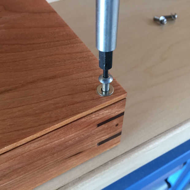 Taladré orificios en la esquina de la parte frontal para el herraje de sujeción pasar a través. Entonces atornillado en pan de perfil bajo de bit hexagonal tornillos de cabeza con una arandela en los insertos roscados.