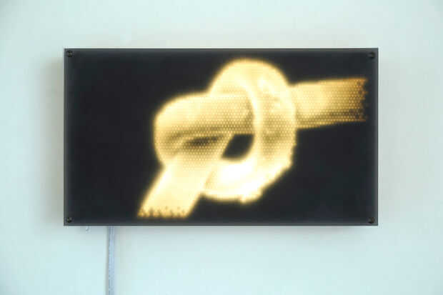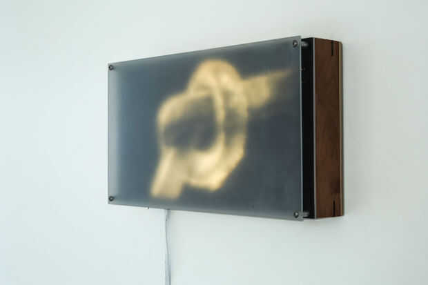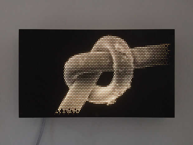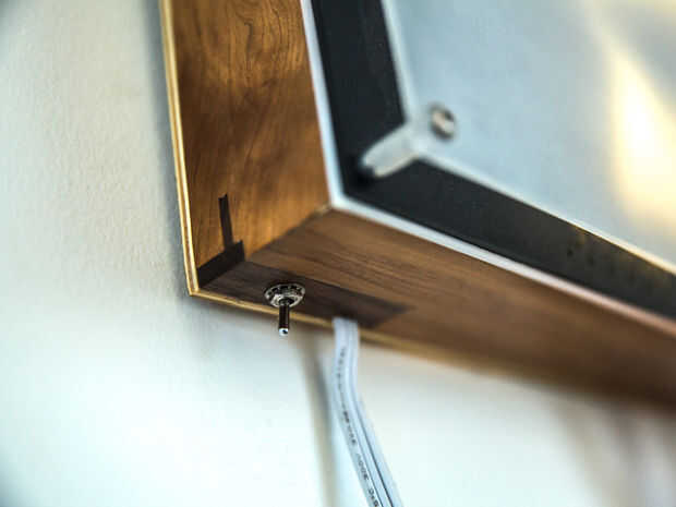 Esta pieza usé acrílico negro para el material de la superficie, que contraste muy fuerte con los puntos iluminados. La iluminación era fluorescente para éste, que dio difusión lumínica, aunque la pieza era mucho más pesada. La capa de desenfoque era otra vez plexi transparente lija en mano, que parecía bastante bien recto, pero atenúa la imagen un poco demasiado cuando se mira desde el lado. Lija el acrílico negro para un agradable acabado mate y ha añadido un sistema de pernos de máquina plana cabeza de negro en el medio para mantener las capas apretadas, en hundido en el acrílico negro. También he añadido un interruptor anticuado con un acento de madera.